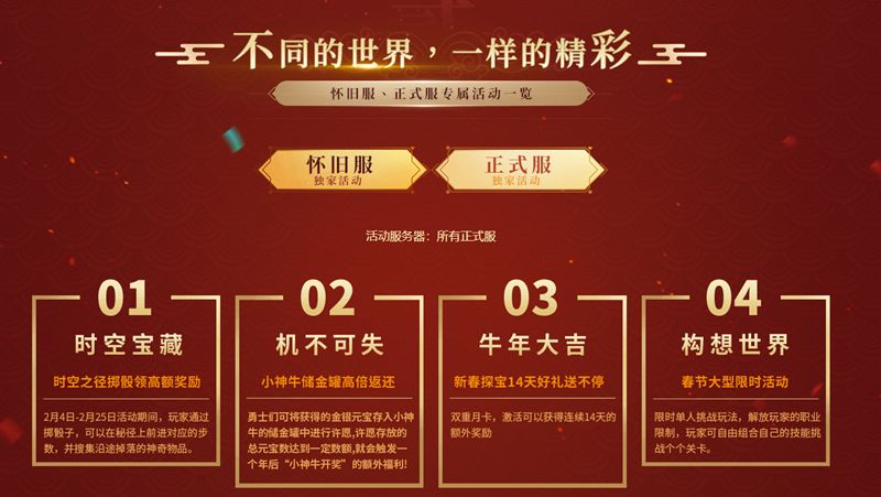 因为正式服和怀旧服底层玩法落地上各不相同,所以在春节主题活动上,正式服和怀旧服均有专属于自己的独家活动,加上常规通用活动,每个版本至少有多大10套以上的春节活动玩法,让玩家在春节假期也能欢乐开荒,实力倍增!