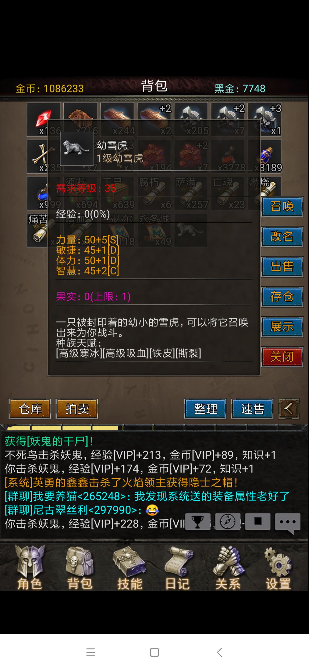 有了黑金支持,我就可以快速研究宠物系统,当前等级32,目标宠物白虎,培养目标力量成长SS,敏捷、体质、智力成长A以上