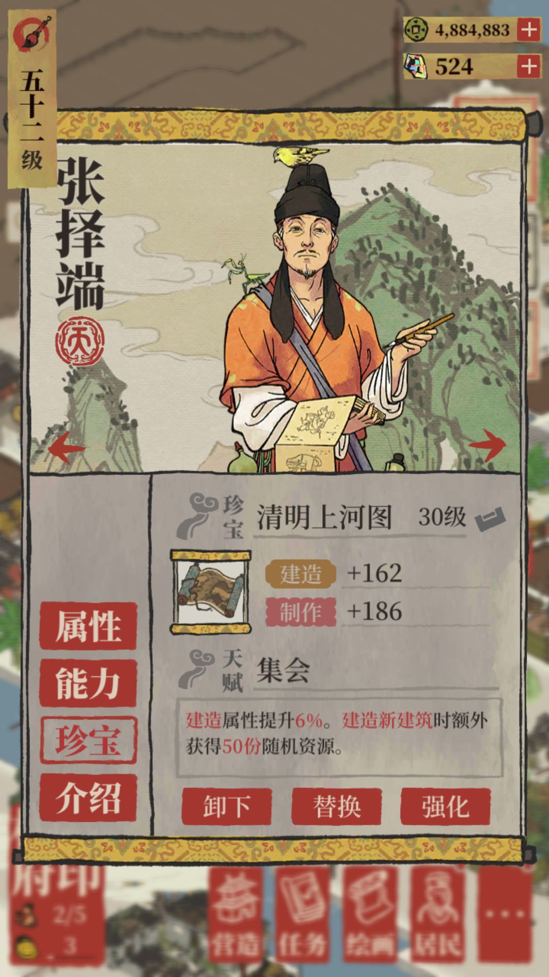 看着其他大佬做攻略都挺好的,但是我是那种最开始比较肝后面平时比较懒的懒佛性玩家。想着有什么办法让我在有激情的时候把这个新府尽快弄好,不搬运其他府的资源发育(搬运多了就比较久,搬运少了就不够用),搬运其他府的东西消磨激情。我就想这个新府的开始怎么弄,因为一开始是最难发育的,生产等待时间比较久。后面就想到了一个人才,那就是张择端,他带着清明上河图就可以刷资源了。技能就在下面