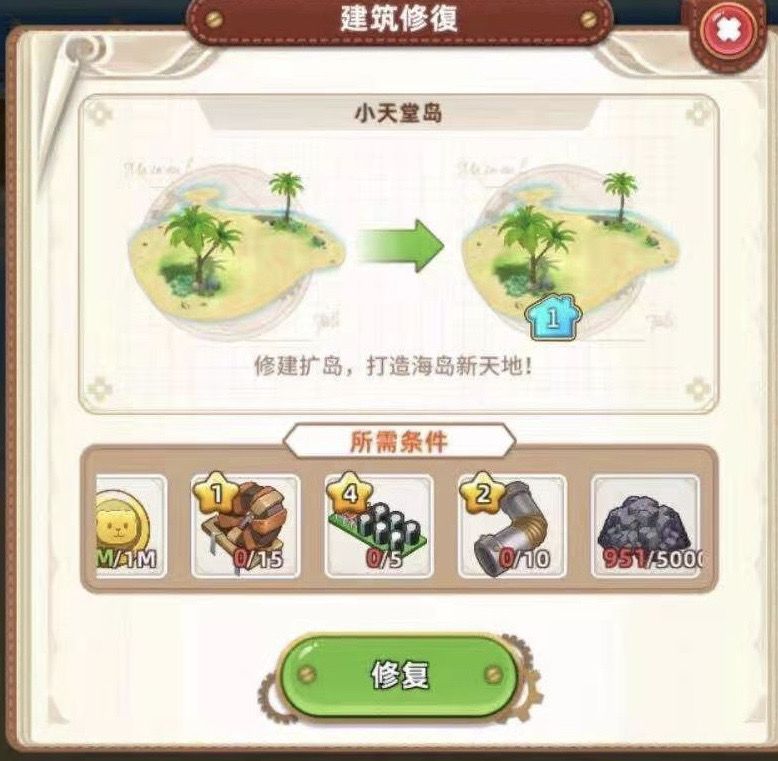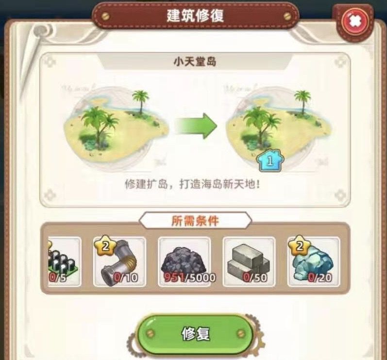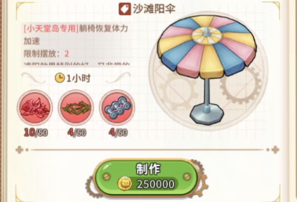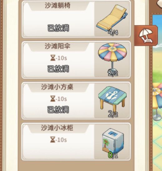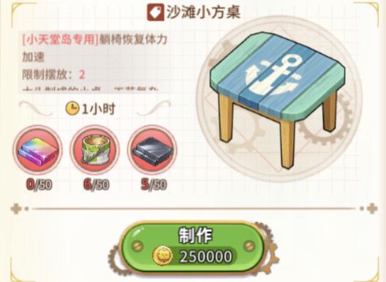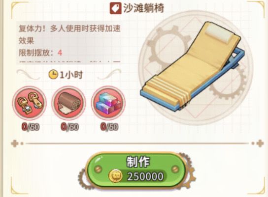 5、关于配置问题,建岛以后一定要优先建造躺椅,只有躺椅的功能是增加体力,其他的都是加速,如果暂时手头不宽裕,又想拥有自己的岛,可以只建造一把躺椅,每日空闲躺一躺。