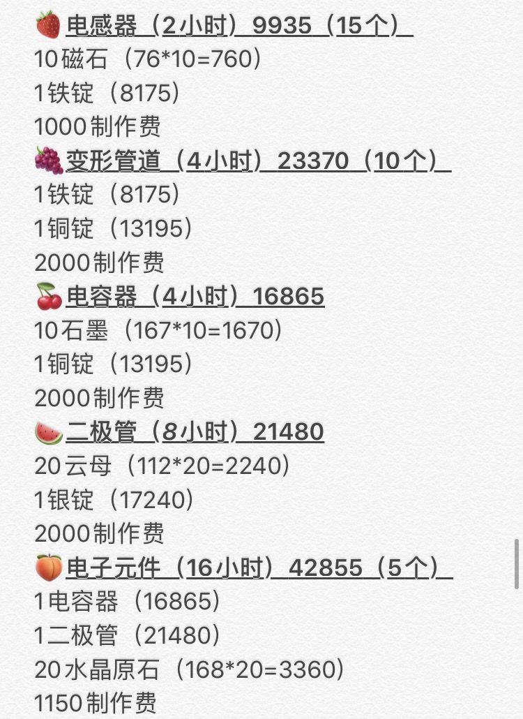 其中电感器之类的,我做了一个汇总,可能与随时集市价格有一点误差,大家看一下大概