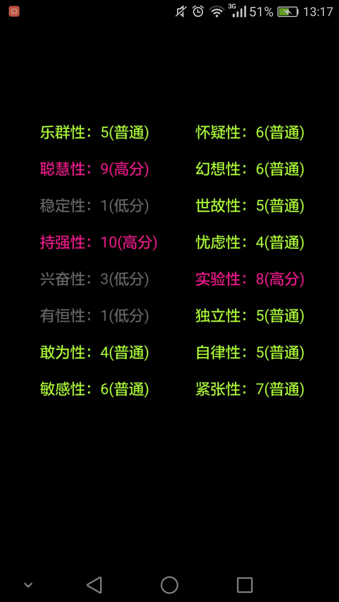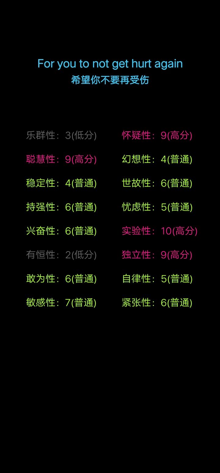 首先,乐群性又掉了,这个跟我去年十二月的个人经历有比较大的关系,也同时导致我的怀疑性和独立性提高特别多。简单概括就是努力了很久的作品被人传谣,被合作小组不理解孤立,甚至在公开场合发生比较大的争吵。