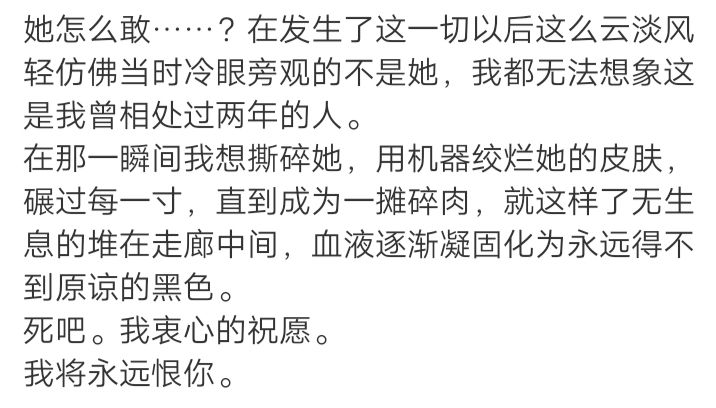 之前我还是基本算得上比较随和的一个人,经过这件事情以后,我对思想上的不同不再那么包容,很敏感很暴躁非常容易生气,会采取很多激进的措施去切断和别人的沟通,固执己见不再轻易信任任何人。