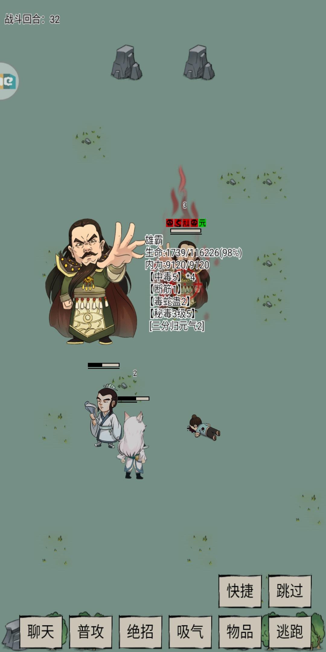 走到65的时候我已经没有5级毒和刀片了,以为要倒在这了,结果试了下给npc喂药,用5级灵药、5级福地血药、生还丹,我就金蛇控一下,砸个蛊赌一下灵蟾,4级毒和3级毒混着扔,结果真给我过了