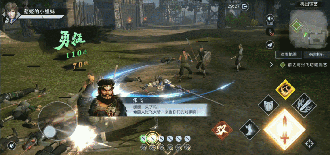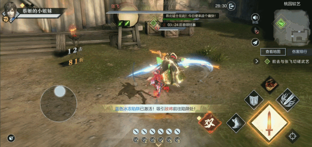 第二阶段,对战张飞。首领战场景中会出现两个光圈,将敌将引诱到黄色光圈中接触其增益状态,引诱到蓝色光圈中则可以冰冻敌将。在一定时间内,敌将身上会出现破绽提醒,只需要按照提示打出对应的连招,就可以击溃敌将,获得输出的时间。首领战4分钟后,敌将进入狂暴状态,进攻欲望、攻击力大幅度提升。