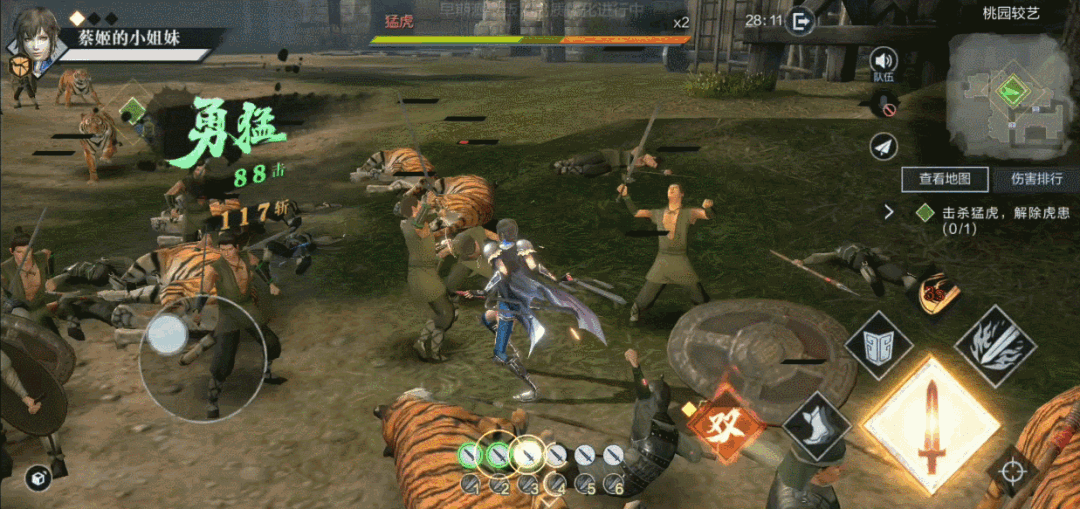第三阶段,击杀猛虎。同样是给玩家叠无双技的阶段,猛虎相对灵活,擅长扑击,需要玩家快速打出连招,在虎群发动攻势时抢先一步将其歼灭,尽量使用第6套蓄力连招,攒出无双技。
