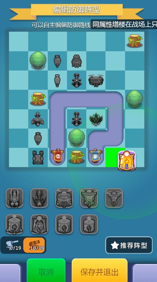 然后拖动炮台到地图空置的位置,显示绿色的方格才可以放置,红色的方格则是错误的位置,地图随玩家想法任意调整,但是每张地图都有几个特殊的位置不可变得,首先是红色和蓝色的旗子分别代表怪物出现和消失的出入口,还有地图里的树是不会改变位置的,只要入口和出口能连成一条完整的路径,地图就编辑完成了!