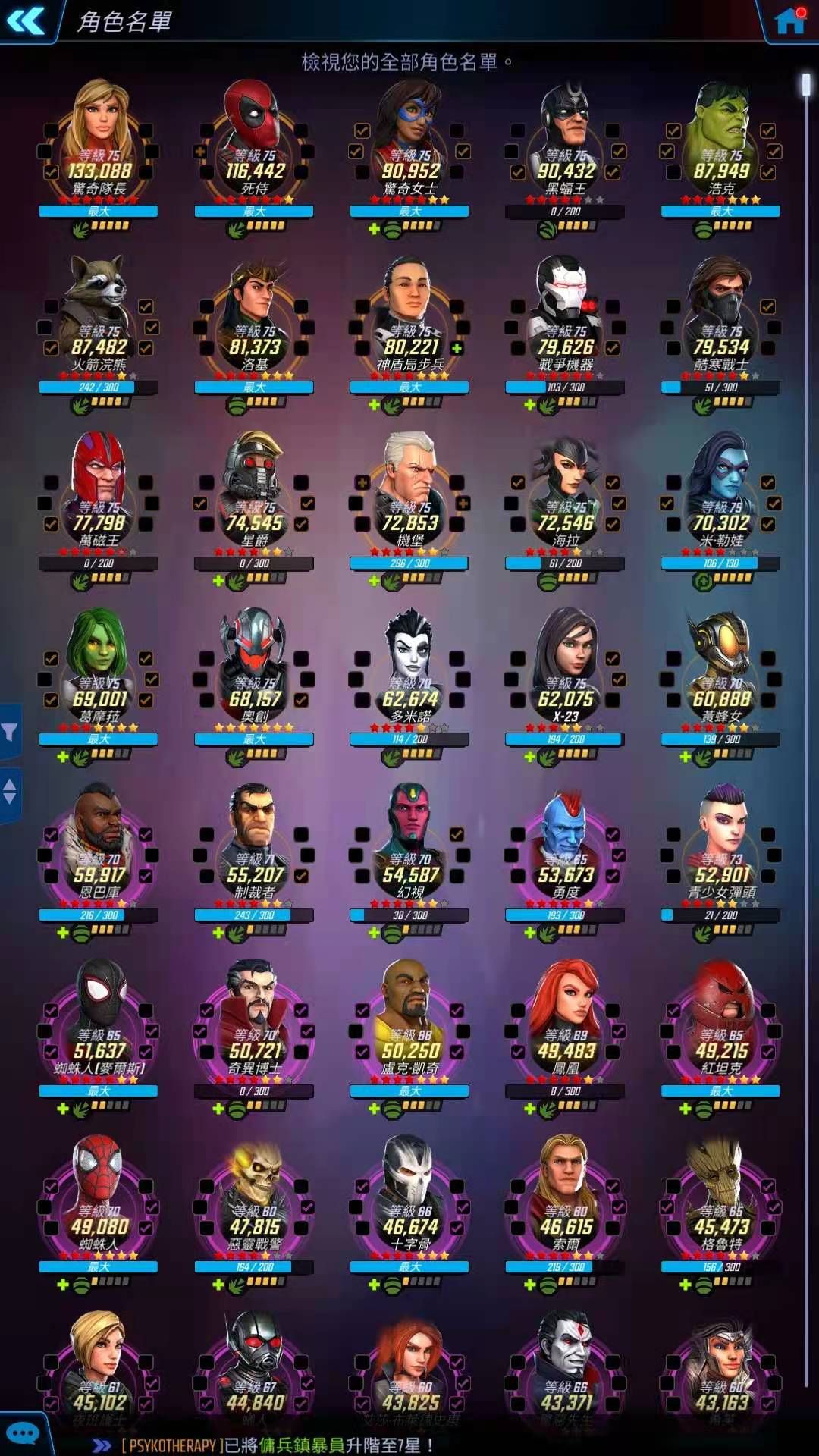 不知不觉也玩了2年多了,在线700多天,死侍和惊队都让我练得妥妥的。目前攒金星币打算给死侍买个满星。别说什么死侍不过是第三梯队的人,我粉他啊,没办法。而且我真心觉得他2技能那跳劈的一下子蛮厉害的。下面是我截至到目前的所有角色。在慢慢练,说实话我是一个非常佛系的人,所以才练得五花八门。