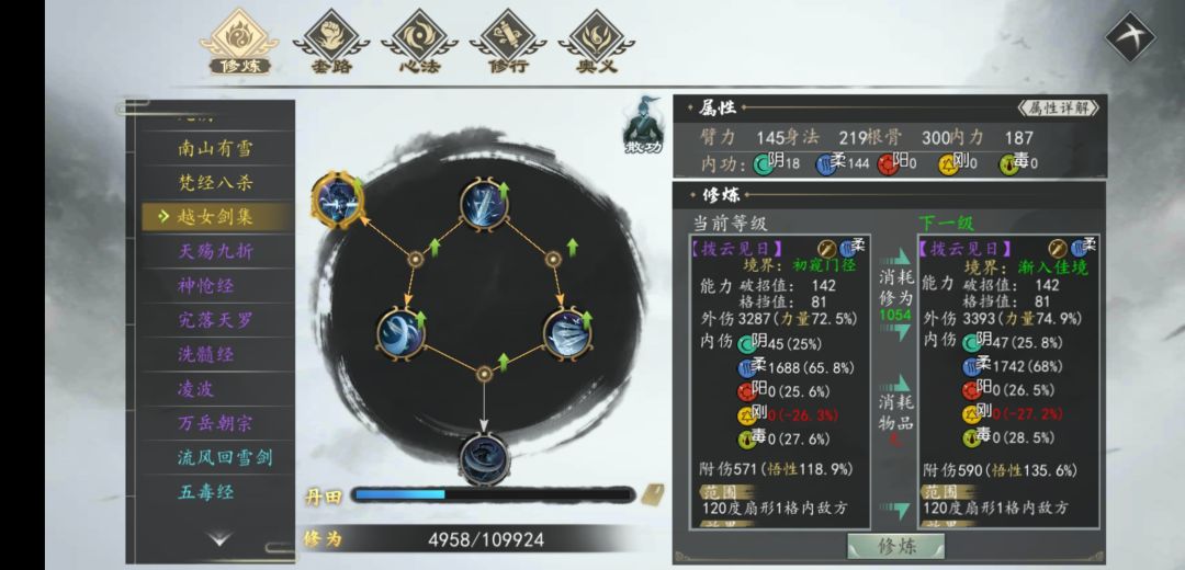 第一个小范围招式,120度扇形一格内敌方,悟性附伤,效果有破甲和乱战(命中越多伤害越高)