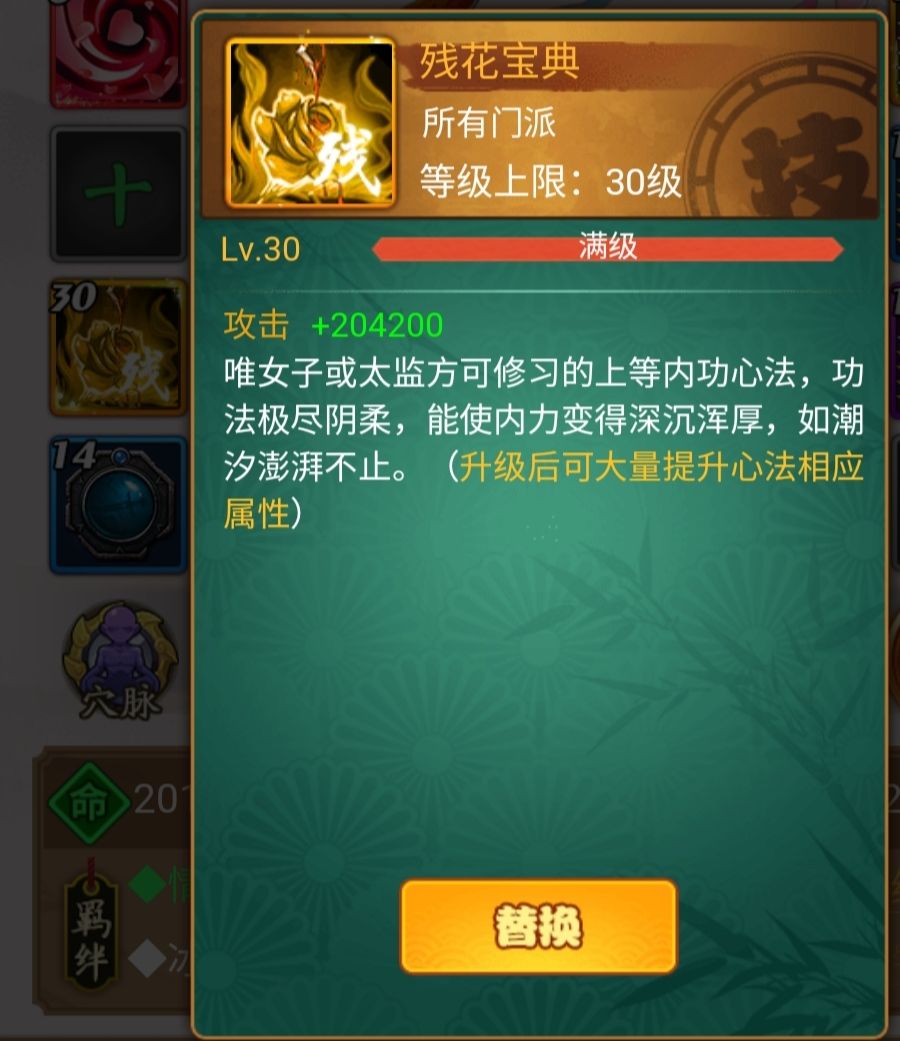 心法自然优先羁绊的残花宝典(不过听说很难出),没有的可以先内劲破顶着先,每次活动的800技能箱子有几率得残花(只要你欧),事件也有几率出残花(买功法,好像是800金条那个),有钱的就买68限时礼包。