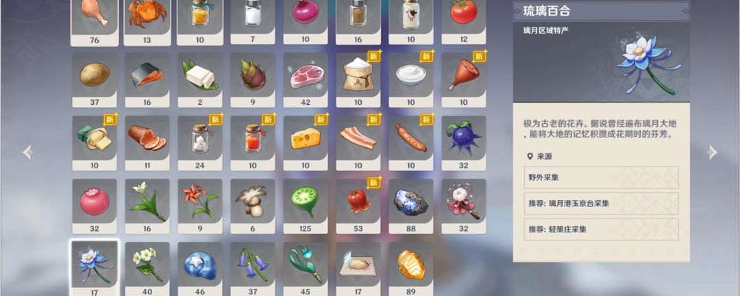 原神中的琉璃百合是璃月地区的特产,是极为古老的花卉,据说曾经遍布璃月大地,能将大地的记忆积攒成花期时的芬芳。琉璃百合主要的刷新地点为璃月港的玉京台和轻策庄,璃月港玉京台的花圃中有大量琉璃百合的刷新点,沿着玉京台的边缘顺着花圃绕圈即可获得发现大量琉璃百合,轻策庄的琉璃百合刷新点则集中在轻策庄北部的梯田中。