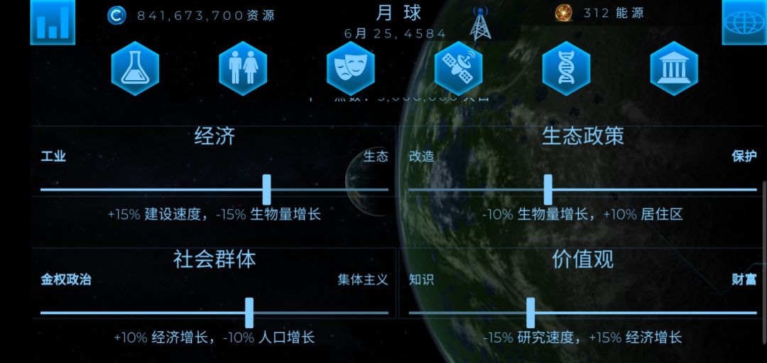 下面是文明界面,可以看到,生物量增长一个-15%另一个-10%(若这两者为0,这文化影响为100%)