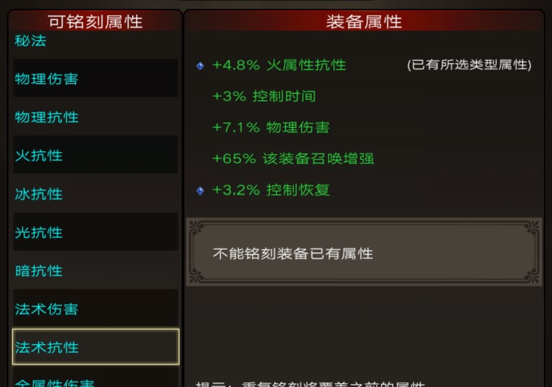 2021/2/8更改 全属性抗性和法术抗性,单属性抗性不能重复出现,已修改,但仍然铭刻可以铭刻上一条属性抗性,相当于洗炼时直接排除6条属性