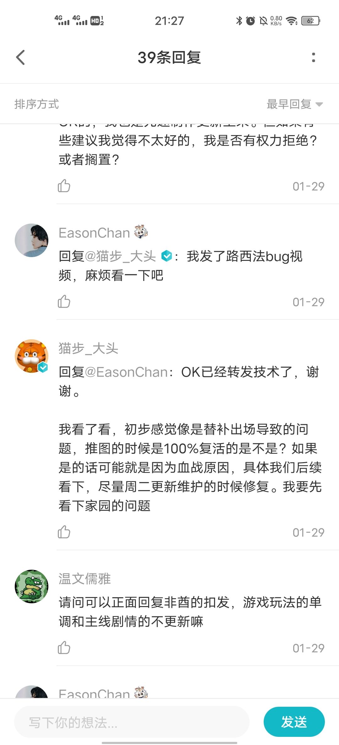 我就想问问大头,是不是对玩家有利的bug,一律修复,对玩家不利的bug,一律能力不够啊?十天了,还没解决呢,“尽量修复”黑鬼bug是啥疑难杂症?十天还没搞好?还是搁这玩文字游戏呢?嘴上说着修复,其实啥也没干。我二百级黑鬼神器不复活,你不觉得离谱?直接影响到了我的巅峰冠军好吧,牛逼都跟人吹完了,你给我不复活?