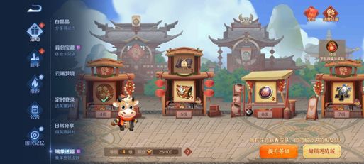 活动期间,通过登录游戏、参与对局等活跃即可获得活动积分;每100积分可以提升1级,通过任务每日最多获得200积分。每级都有免费年货奖励,小牛提升等级之后,会前进获取对应奖励,部分等级还有额外的进阶奖励,拥有任意【天文志···-瑞象】皮肤,即可解锁进阶版。