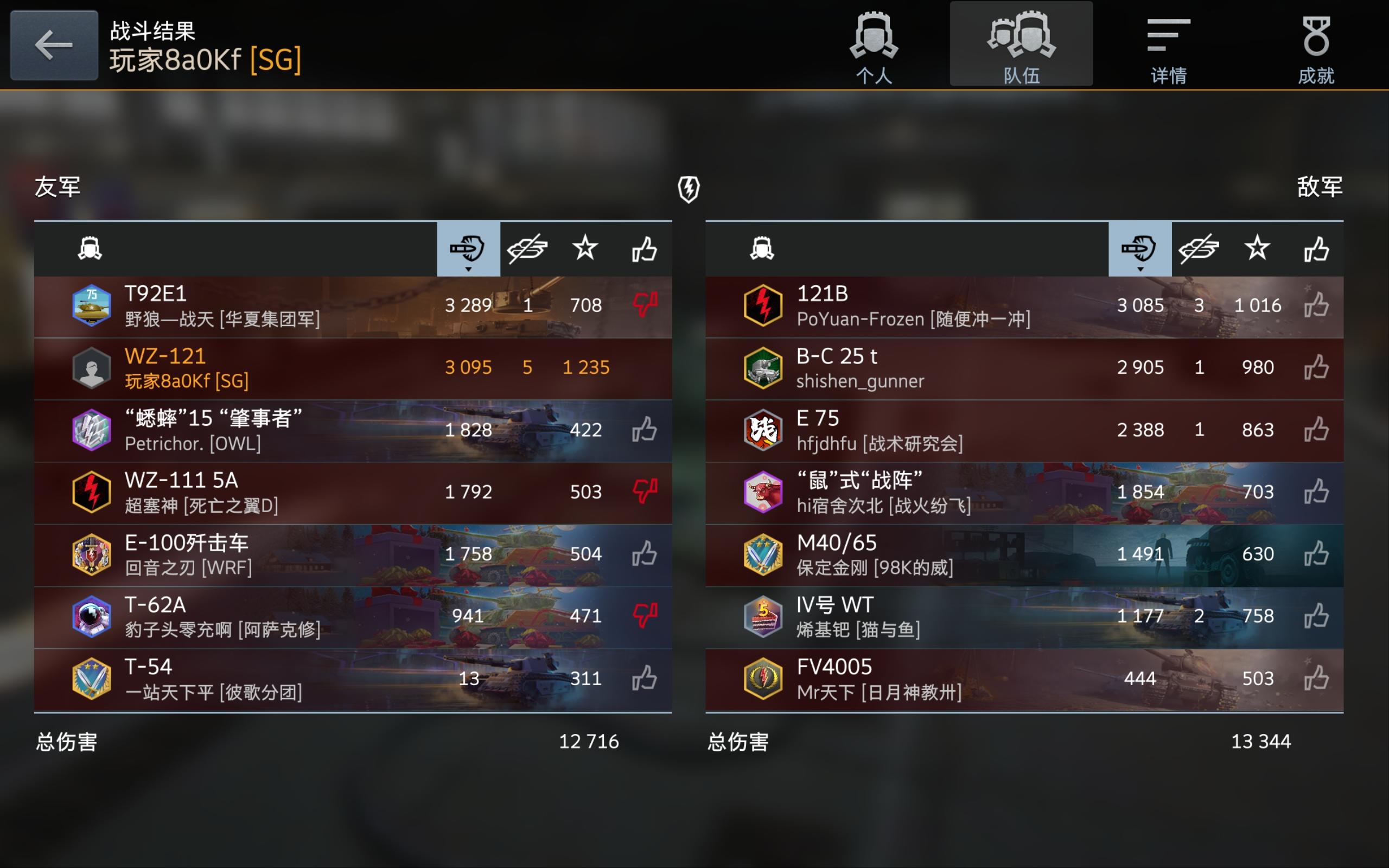 62一跟中坦对上就冲入人群,想都不用想直接就没了,当时我刚收了老鼠一发过路费,炮管还没转过来。(自家重坦一对二没优势)很快啊,这62就开始打字喷我,我寻思着我开的又不是谢尔曼M1,拿头去救人?没理他,马上T54也跟着下去送了吗,中坦线重坦线双重劣势。我和残了的92E1收掉对面冲过来的查查,对面还有一个500血的121B和4005,这92E1就为了这一炮血,强行探头开炮结果把自己搭进去了121还在。它一死也来喷,我也没法把我的血送给他啊,残血跟对面两辆车换我怎么救?好家伙,两个跟找着了伴一样根本不消停。搞掉对面的121B和4005我也快完了,五棍的HE和JBD跟铂金铸的一样打不得,硬是给对面两血皮重坦收了,哦豁,这下倒好,三个娘们一台戏唱的我是头皮发麻。废了好大劲打的对面只剩下一个没亮的四运,实在不行对了一炮送了。