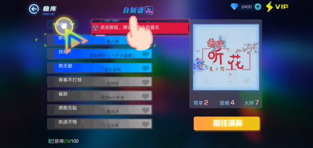 A1:游戏首页【典藏馆】玩法——右上角【曲库】——上面【自制谱】按钮