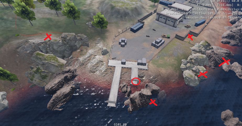 如上图也是蹲伏的点位推荐,红色圈是撤离点,我们可以就近选择制高点,去蹲伏地方,打叉的地方都是合适的蹲伏地点哦!