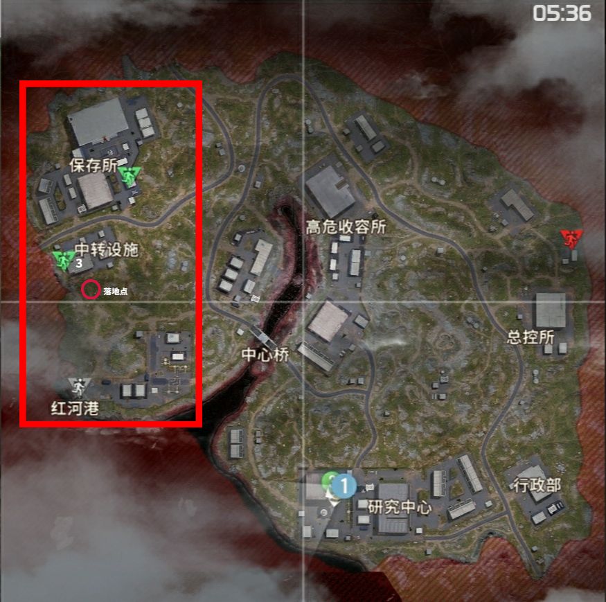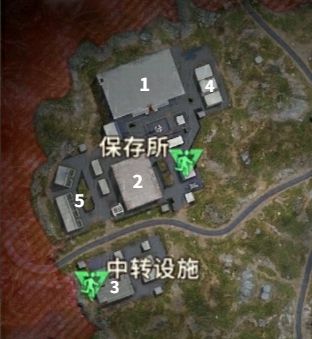上图是我个人做的一个简易资源分割图,保卫所和中转设施大致分为五个区域板块,其中1、2、3号区域,都是高危区域,属于资源多,但是也很容易遭遇敌人的区域;而4、5号区域虽然资源相对少很多,但也相对安全一些,很适合前期落地后缺少武器的情况,较容易通过搜刮武器在前期获取一定战斗力。