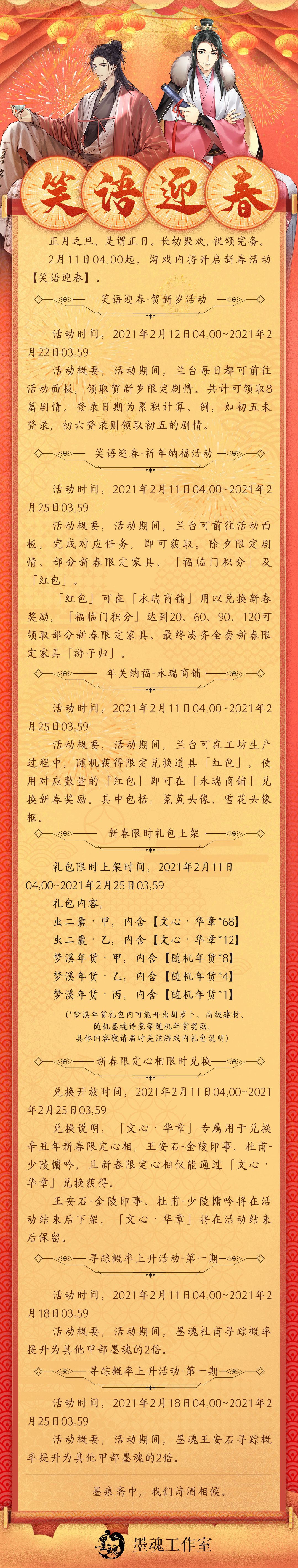 活动概要:活动期间,兰台可前往活动面板,完成对应任务,即可获取:除夕限定剧情、部分新春限定家具、「福临门积分」及「红包」。