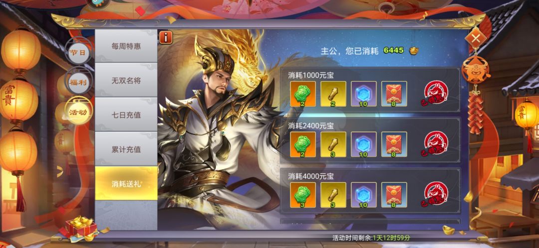 零点刚过,迫不及待的进入游戏。在花里胡哨的活动界面买买买。猛然发现,不管是三国令还是节日礼包界面都没有重生令可卖,我承认昨天的15发令重生田丰草率了。日礼包,周礼包,月礼包买吧!贵是有道理的。万一一不小心出来了呢!怀着忐忑的心情一二三,好的!18是个吉祥的数字,虽然天命没出😌该换的还是要换的,抓道人走起。六千元宝瞬间干光,也不知道自己抽中了多少签子?那些都不重要,反正换颜良文丑是够了!