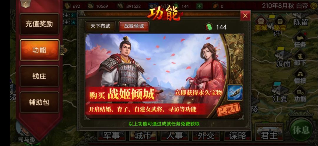 存档前两年买的DLC,现在游戏进行到210年了都没见着一个女武将,全势力都没有一个。