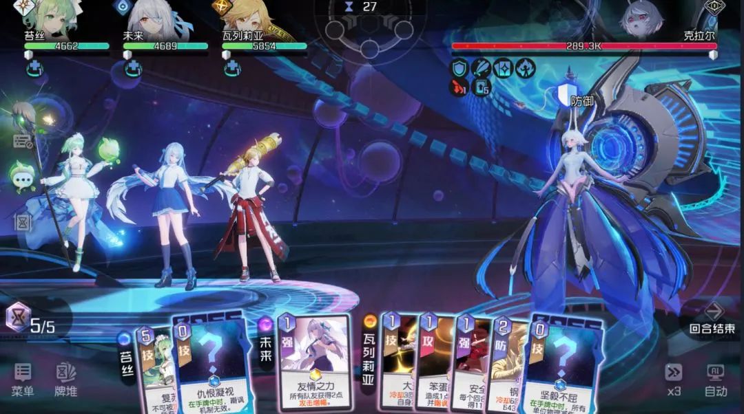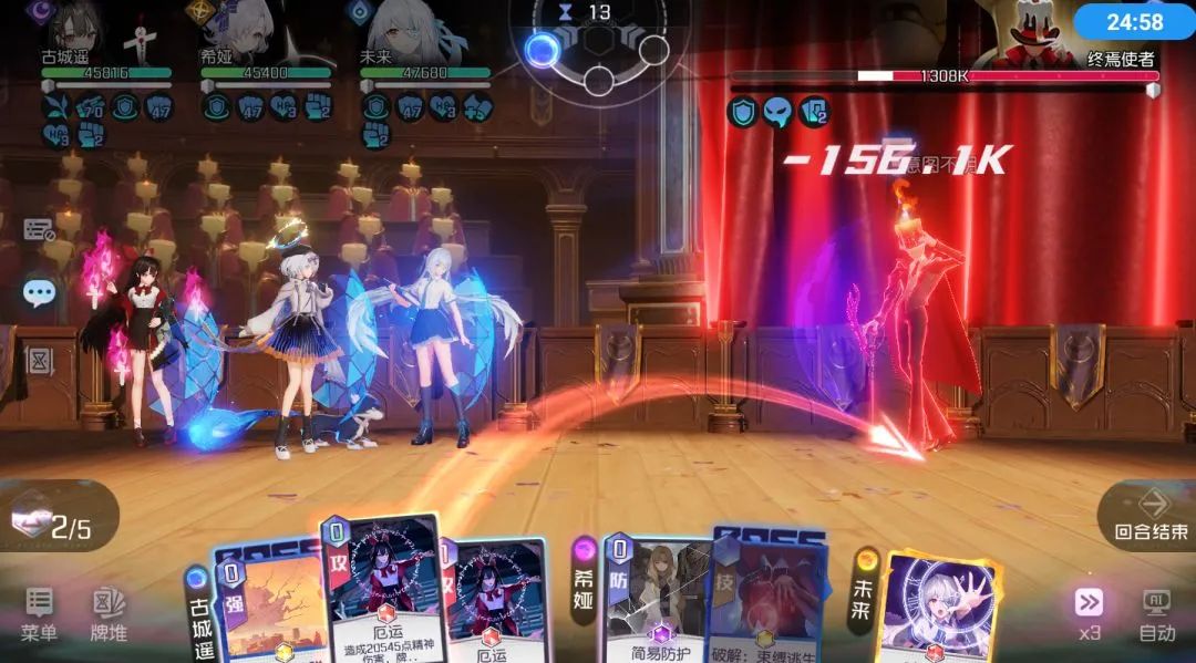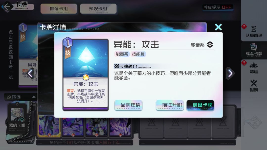 使用奥弹炮、异能攻击进行合理增伤,输出走“极端路线”强化固定伤害额度较高的1-2张牌,然后放弃终结技的思路,去打高伤的手牌。