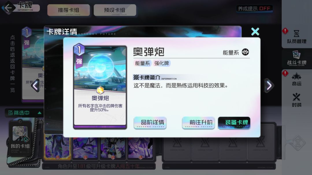 奥弹炮是能量系角色唯一的强化卡牌,能力非常强。它可以按照百分比进行提升冲击卡牌的伤害,并且持续整场战斗!(耀阶提升50%)