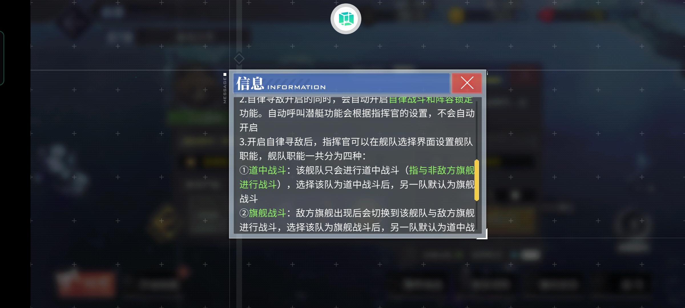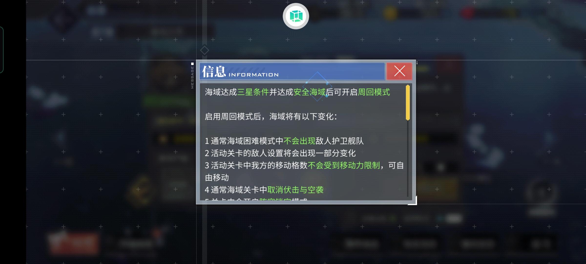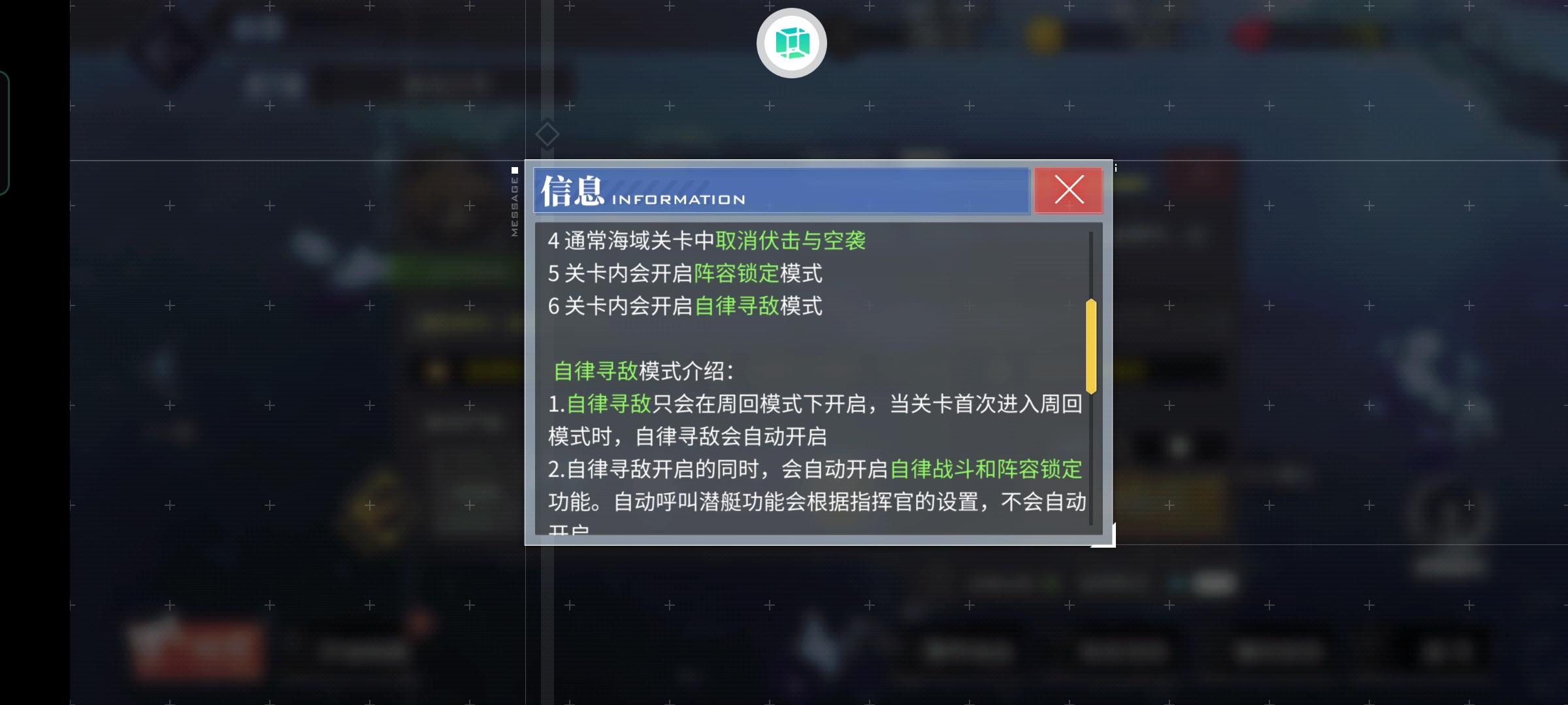 就是这个绿绿的安全海域一开始是红色的高危海域,你只有不停的刷,刷到安全海域,并且3星后就会开启自动寻敌了(第一张图窗口右下角),具体逻辑啥的就在下边几张图里有说的,我没具体看,反正能挂机就完事了,希望对那些还不知道这玩意的老哥们有帮助吧