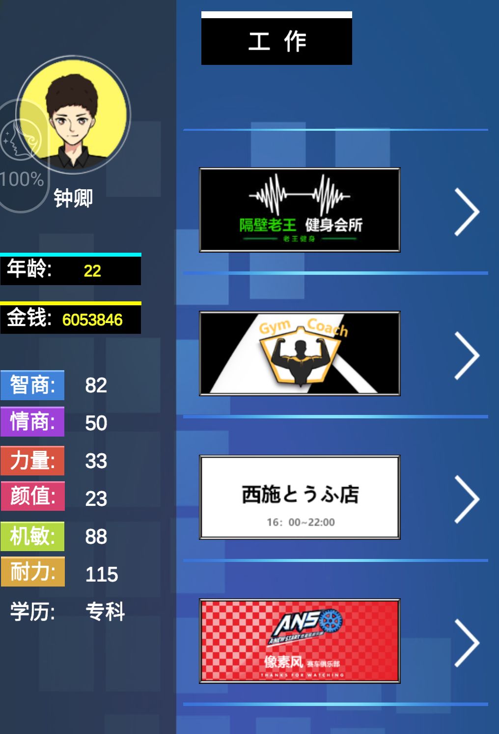 这个游戏挺容易让我上瘾,看着他们一下子就几十万就排上富豪榜前10,我还是月薪才3000的穷小子。我狠下决心,看广告,最后把属性拉起来。这里我告诉大家一个攻略,迅速上富豪榜前10,首先找到《像素风赛车公司》,直接找1百万的月薪职业入职。但这个前提得满足他们的属性。这个就得刷广告了,因为这个职业不需要文凭,不需要工作经验。我前面就掉坑了,大家可以19岁就可以月收入百万了。