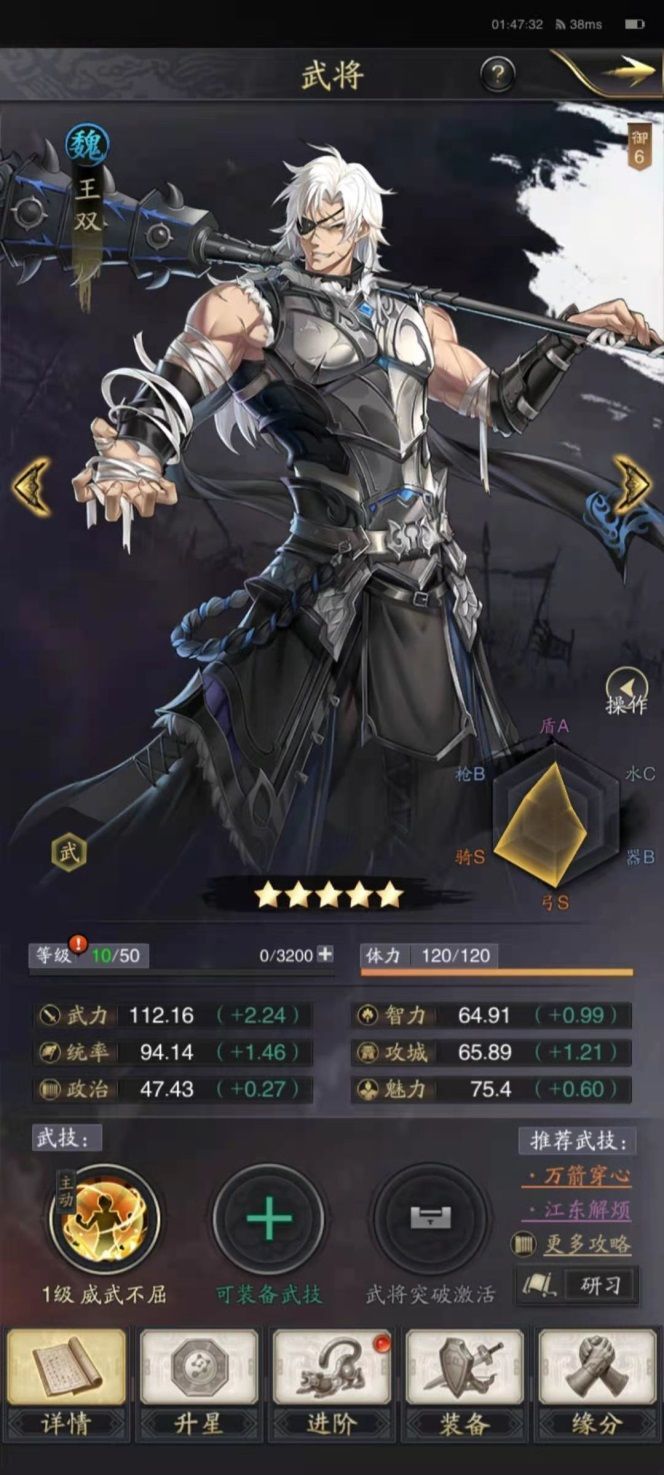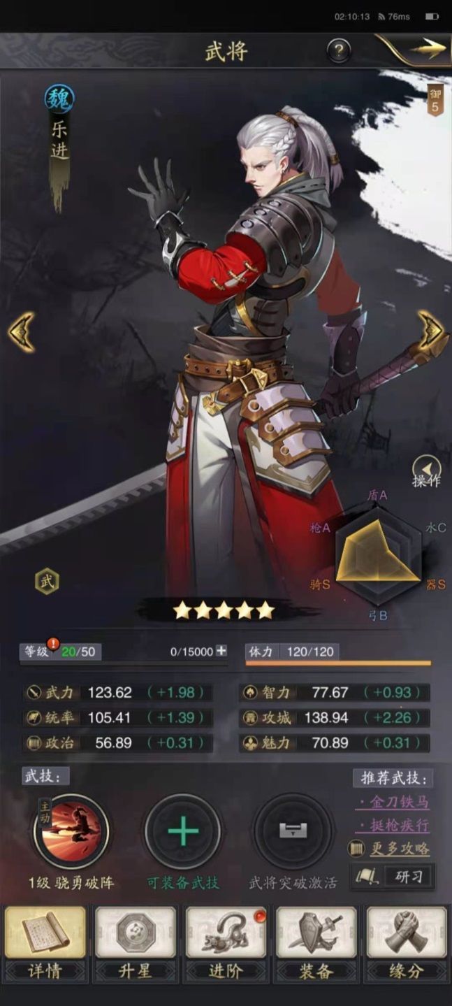 乐进,对单体目标造成的伤害相对较高,而且一定概率可以触发破甲效果。对于部分统率较高的敌人,能有相对较好的针对作用。既然,搭配武技强袭(研习伊籍)自然是少不了的,还是那句话,争取短时间内让伤害最大化。