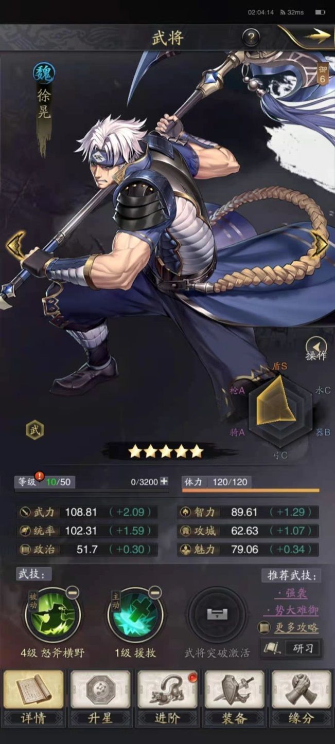 菜刀队的代表,输出简单粗暴。唯一的遗憾也许就是其武技只能对单体目标发动了。为了将伤害最大化,我们在武技搭配上选择加入挺枪疾行(研习李通),将我们对单体目标的伤害最大化。