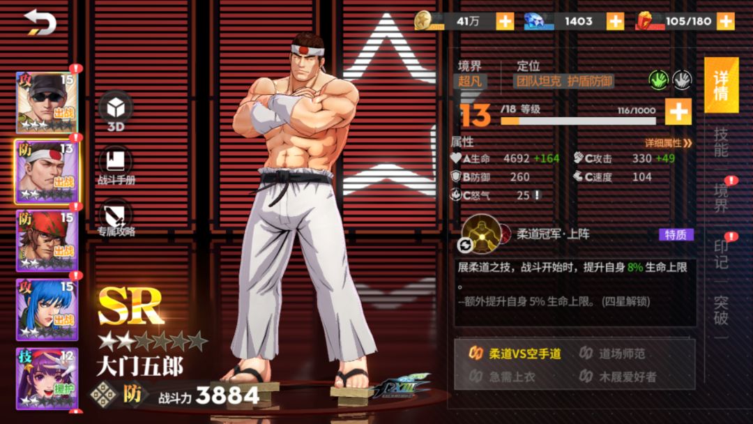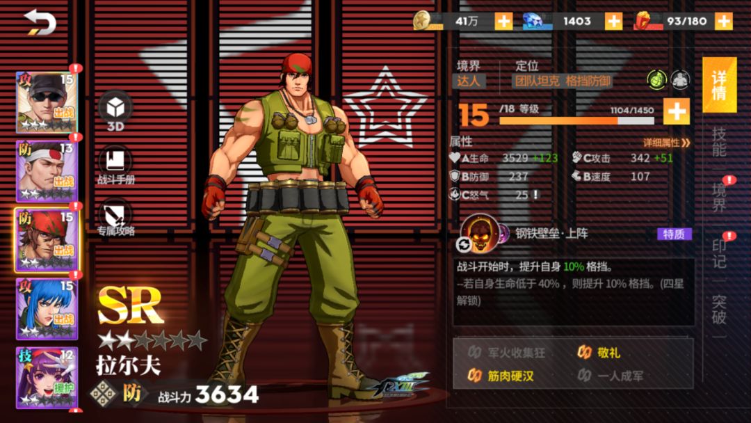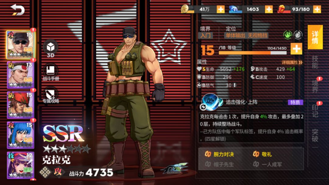 上述阵容为目前《全明星格斗》“军队”类型格斗家阵容搭配方案之一,大门在前期剧情后自动加入,而莉安娜与拉尔夫为“SR”级别,克拉克为“SSR”,从角色获取难度上来说,算是非常友好。当然,后续针对阵容仍可改进将莉安娜替换为支援角色,上阵《合金弹头》系列参战角色马可·罗西。那么,这套“军队”阵容的伤害输出,将会再一次得到飞跃般地提升。
