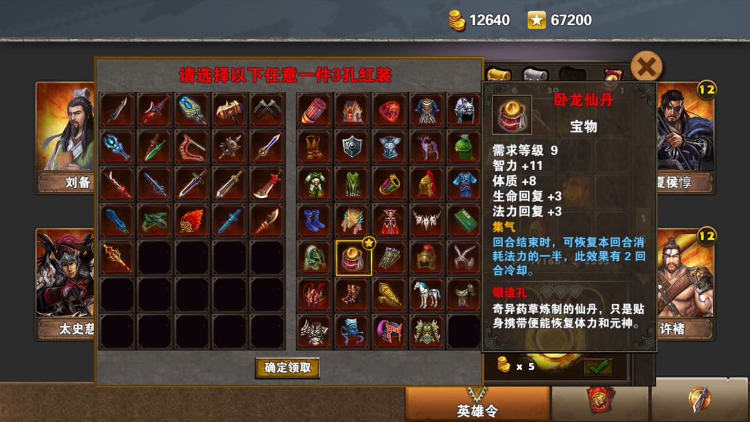 卧龙丹现在用的地方比较少,回蓝装出了水镜冠和清灵冠,用途少了很多。省蓝回合在1,4,7回合,省的蓝为损耗一半,若技能蓝耗低的戴紫金冠,蓝耗高的如诸葛,147回合开气象和闪电,能省下大量的蓝。