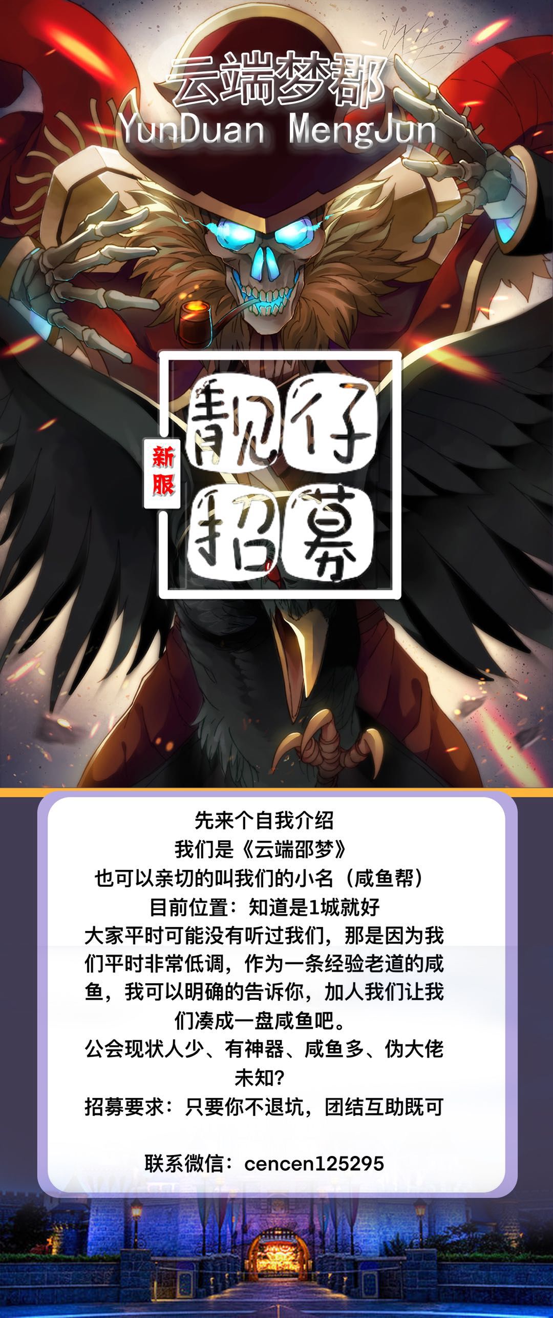 本人是微氪玩家,之前弃坑了一段时间现在回坑了,想拉起一下小伙伴重温旧梦。公会大部分都是佛系养老玩家,这次想招一下新萌,大佬来加入,一定要是大号,