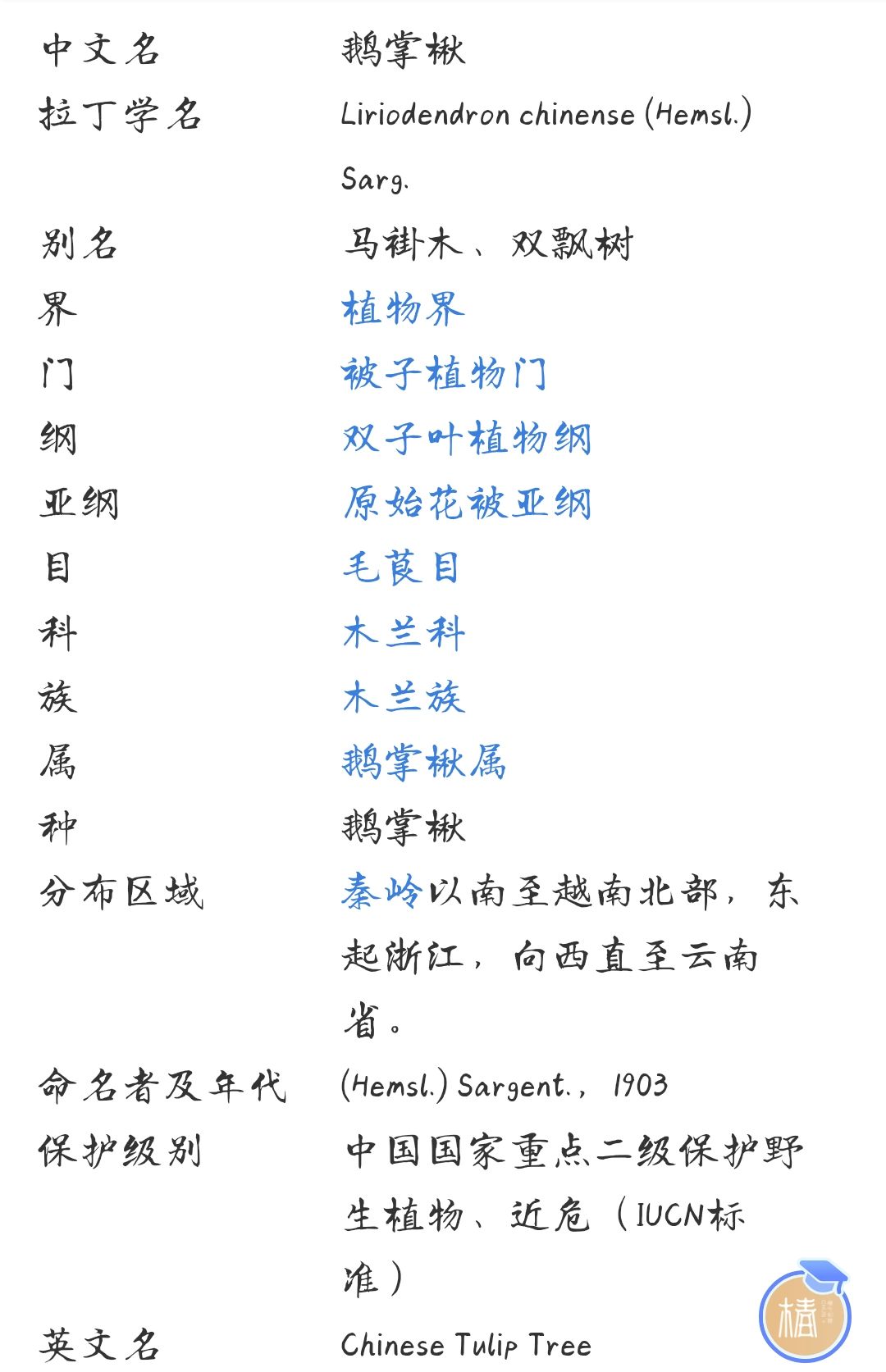 鹅掌楸,近危Near Threatened(NT)国家二级重点珍稀濒危保护植物。由于是很好的木材,所以遭到了滥砍乱伐,加之结实率低,种子发芽率也低,所以也是很难更新的树种呢。(有一说一它的生长速度还是很快的⊙∀⊙!)