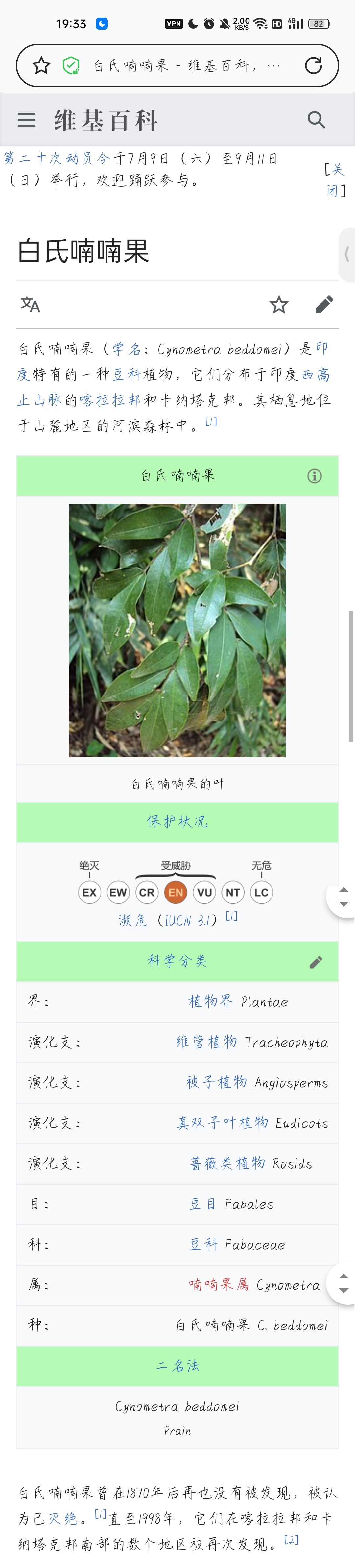 白氏喃喃果,濒危Endangered(EN)。喃喃的资料暂时还没有更新哦⊙∀⊙!所以虽然又重新发现了,但在名录上还是灭绝状态。(由于在印度,所以我国没得什么它的资料)然后也只有北城百科里面找到了相关资料(来自维基百科),我最近也找不到北城百科了,维基貌似要,用梯子,然后2022年6月,我请群友去查了一下,还是一样没变的。