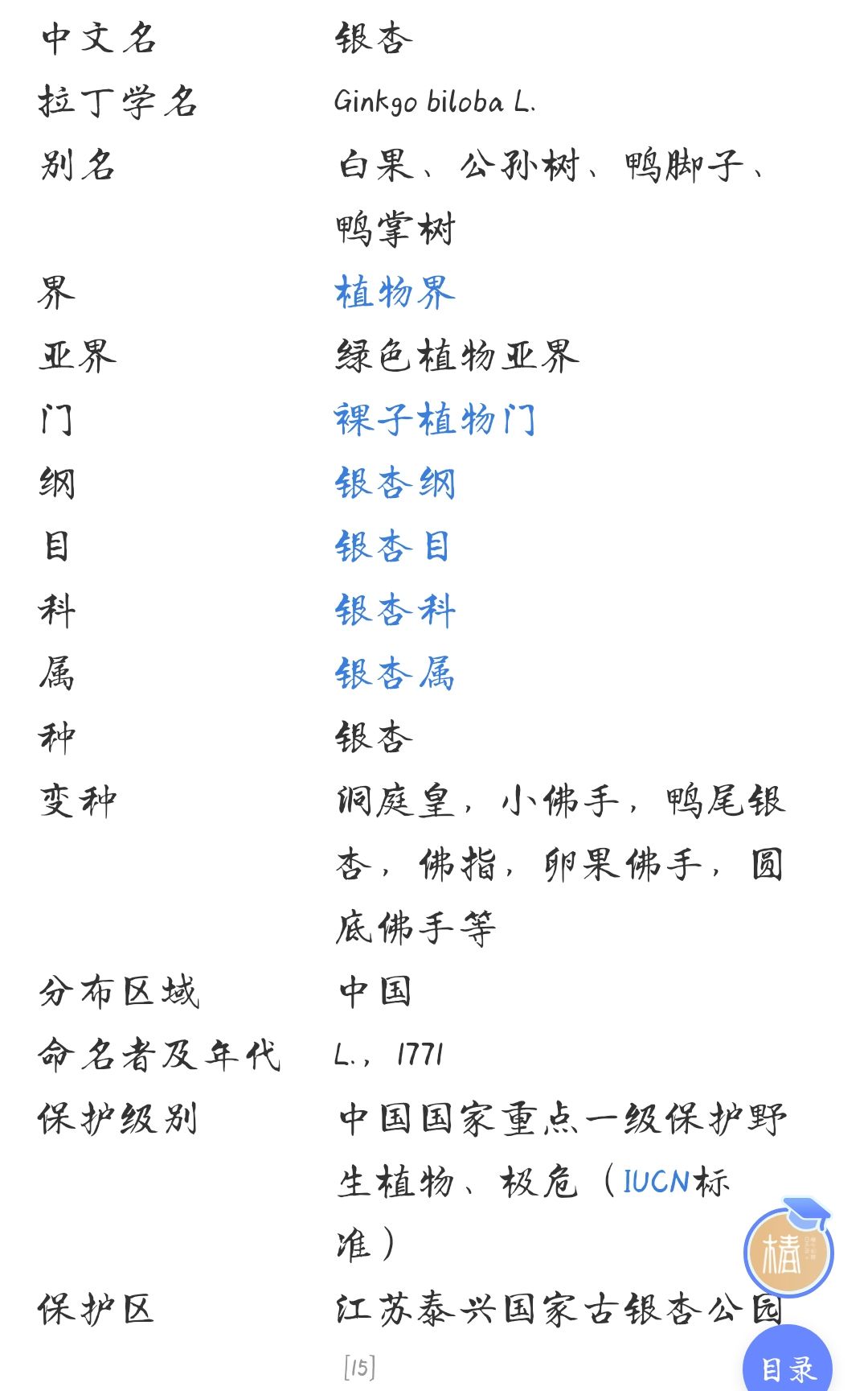 银杏,“极危”Critically Endangered(CR),国家一级保护植物,中生代孑遗稀有树种。