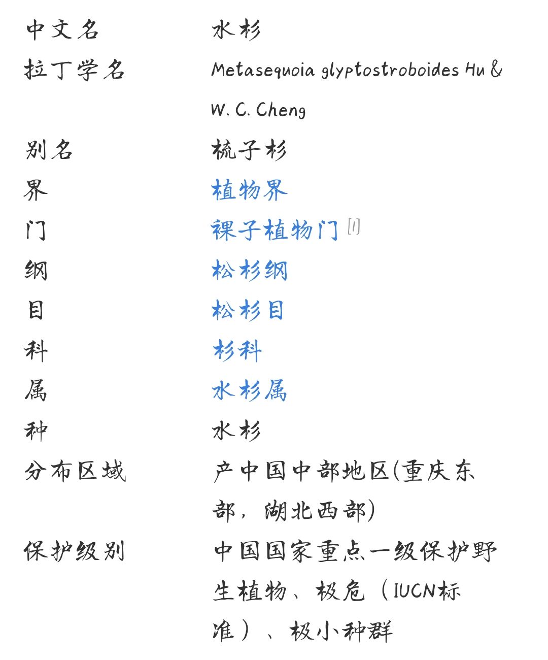 水杉,“极危”Critically Endangered(CR)。我国国家一级保护植物。水杉是世界上珍稀的孑遗植物,有活化石之称,对于古植物、古气候、古地理和地质学,以及裸子植物系统发育的研究均有重要的意义!