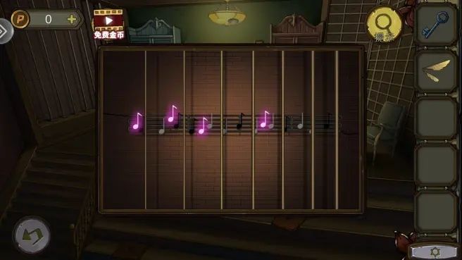 根据里拉琴琴弦变红的顺序,弹奏墙上的琴,音符发亮。根据发亮音符在五线谱上的位置,解开柜子的音符机关,拿到绿色宝石。(琴谱顺序:56513;音符位置:2,4,1,2,5)