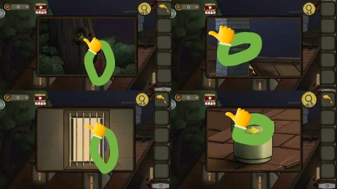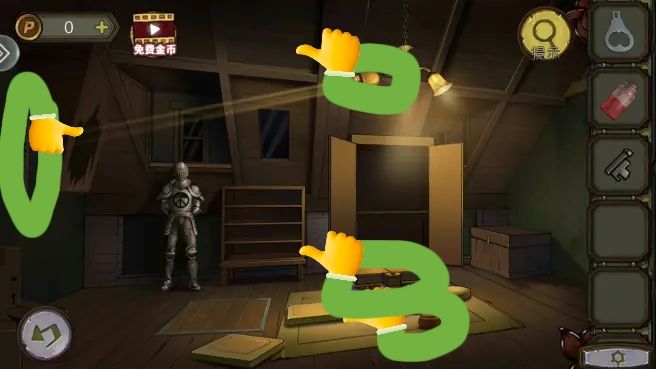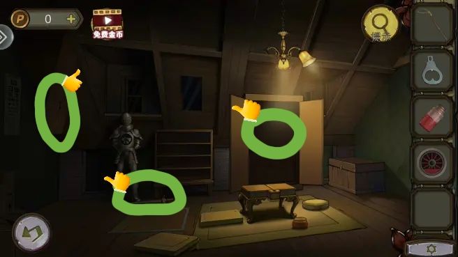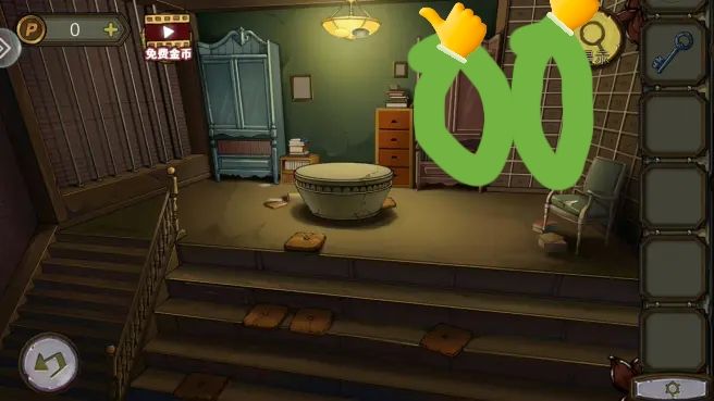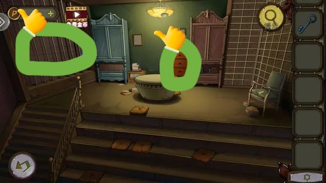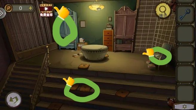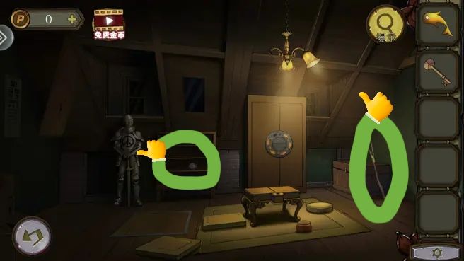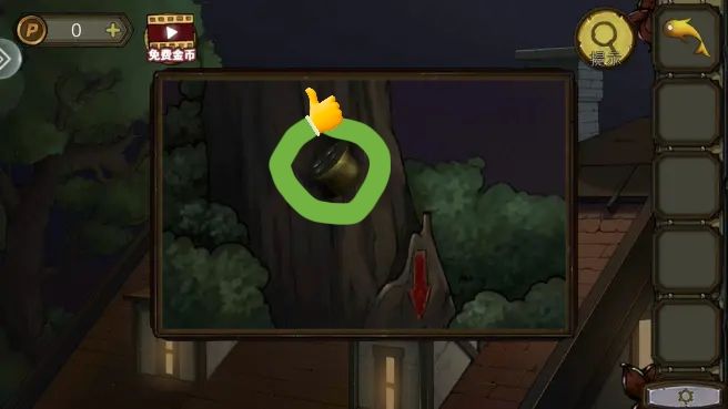烟囱后拿到金鱼,花盆里拿到钥匙。根据烟囱、花盆、树和窗户上的箭头图案,打开盒子,拿到焊枪。用焊枪打开窗户,进入阁楼。