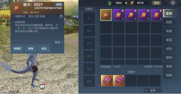 福卡有【新】【年】【快】【乐】【2021】五种,集齐五张福卡即可合成福字,兑换新春礼盒~福卡是可交易道具,大家可以在阵营或者氏族频道和其他旅者交换福卡,也可以在拍卖行进行上架与买卖~