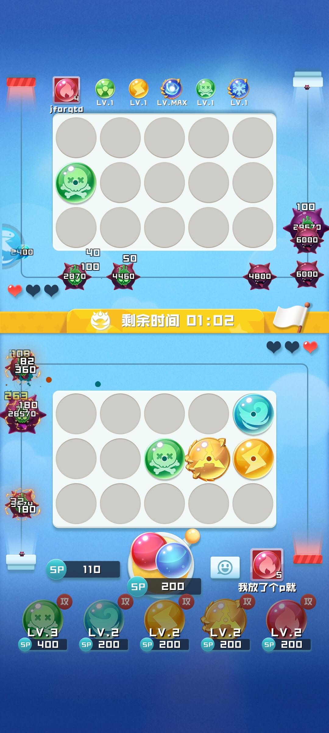 开局对面两个传说元气弹秒天秒地,但是球特别少,应该都拿去升等级了,我勉强撑到了boss,boss是那个忍着,上来把对面球全秒了,但是我球铺满了,结果剩了三个球没被打掉,然后对面只够买一个球的了,一开是个一级毒,我就靠着我这三个球打败了他