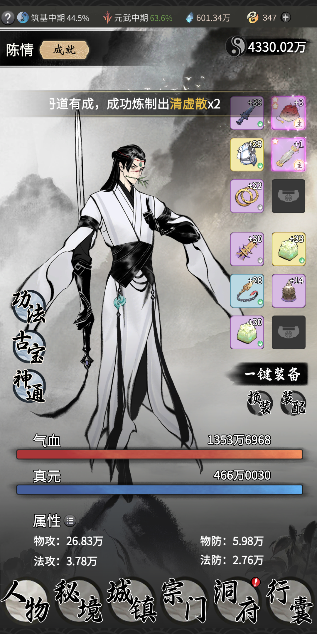 5.下面我讲法宝,正常一个人可以带6个法宝,都是自己炼制,体修6个法宝中,都是单伤,或者群伤,或者在几秒内百分之二十的加成,唯独没有盾的技能法宝大家一听,唉!又不错,30几万的攻击加20能有个几万呢,是吧。