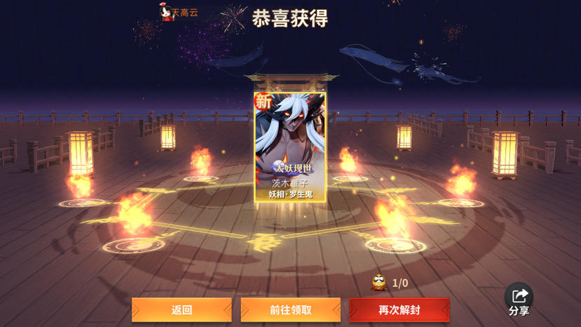 今天樱子送了个金达摩,然后出了个大妖!!!!大妖!!!茨木!!!我可以!!