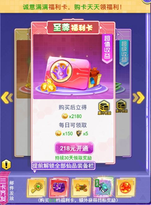 下面要说的就是仙品了,如果想要快速开启仙品格子,那就必须要买三卡了,可能很多小白玩家不知道三卡是什么有什么用,买了三卡不仅仅是提前开启仙品格子,格子开启了我们就可以装备仙品装备,提升战力。