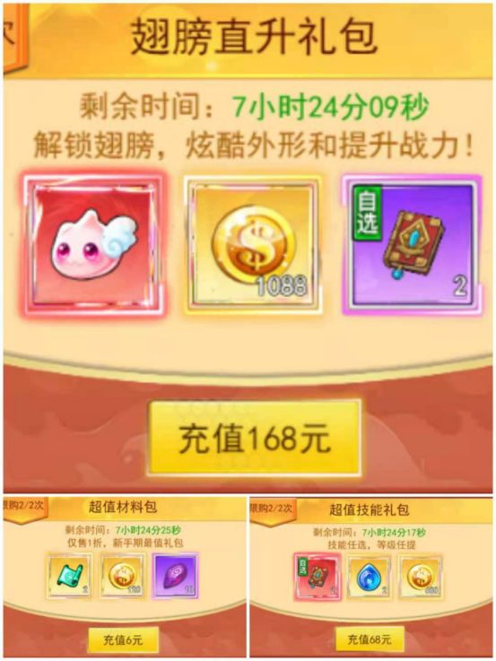 3.168、68和6礼包:三阶直升包子、技能书、神话石、仙品秘境卷轴、技能铭文、三个礼包一共1888金币