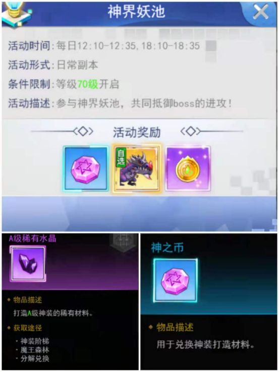基本上一些大大小小的获得都已经了解过了,还有就是一些日常获取材料就可以提升战力的地方,那就是神装,神装是有副本的那就炼狱阶梯,不仅仅是掉落材料还直接给装备,还有就是每天打一打神界妖池和魔王森林就可以获取材料,偶尔有活动的时候也是可以获取到神之币(神装材料),活动狂揍BOSS也是会给很多神之币的,神装穿戴加战力,然后他还有一个套装激活效果。