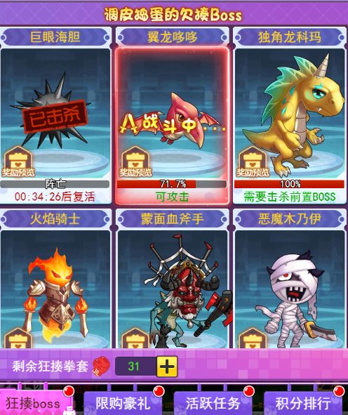 比如开服第二天要开的活动,狂揍BOSS,掉落各种材料,这个活动掉落的道具是比较全面的,建议大家要冲击战力榜的前些天可以在这个活动获取材料,提升战力。