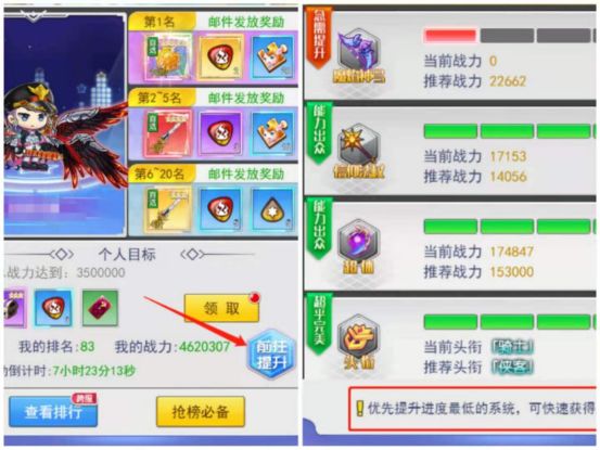 每天的排行榜里都会有一个前往提升,但是战力榜不同的是,他是需要提升所有能提升战力的地方都要提升,其实前八天能提升战力的地方是很多的,我下面要一步步来说了。